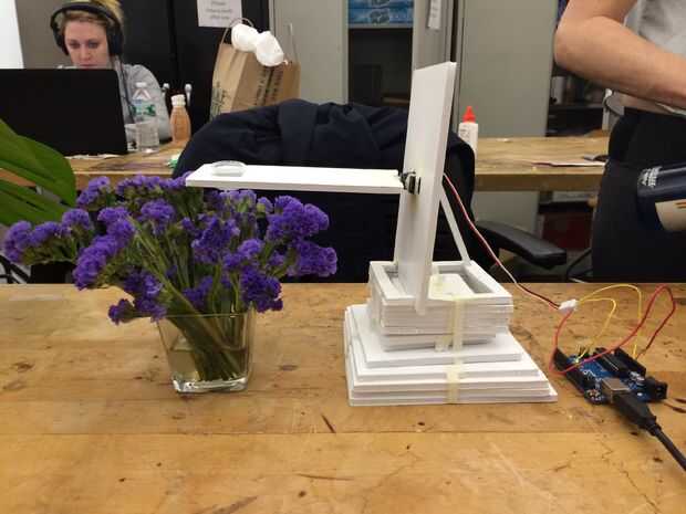 Levante su copa de agua en la plataforma del fotosensor para ver si su código está funcionando correctamente. Si todo está funcionando bien, su servo debe girar 90 grados y sus plantas en el otro lado del agua. Usted tendrá que añadir el agua, por supuesto.