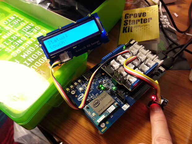 Instrucciones aquí: - Colocar la pantalla de Seeedstudio Grove en el tablero de Edison. Este ser sencillo, sólo debe cuidado de no doblar ninguno de los contactos del escudo de Arboleda. Se puede ver en la foto el escudo de Grove a la Junta de Edison.