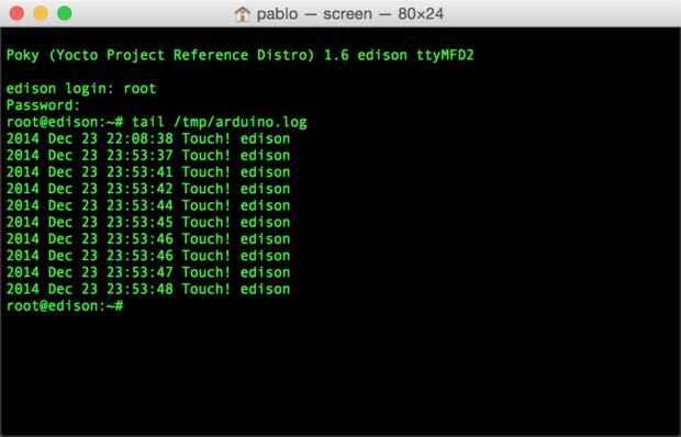 Así, el bosquejo modificado a continuación, cada vez que se activa el sensor de contacto, añade una línea con la fecha y hora, junto con el mensaje "toque!" y a la /tmp/arduino.log archivo host de la Junta de Edison