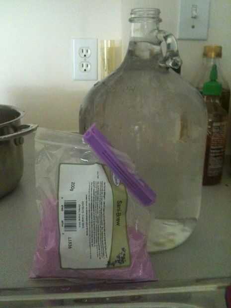 Imágenes: Botellas de cerveza con desinfectante sani-elabore cerveza, desinfectar una Damajuana de 1 galón, mead echadas y recargado en una Damajuana de 1 galón.