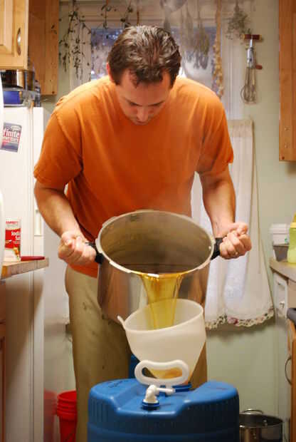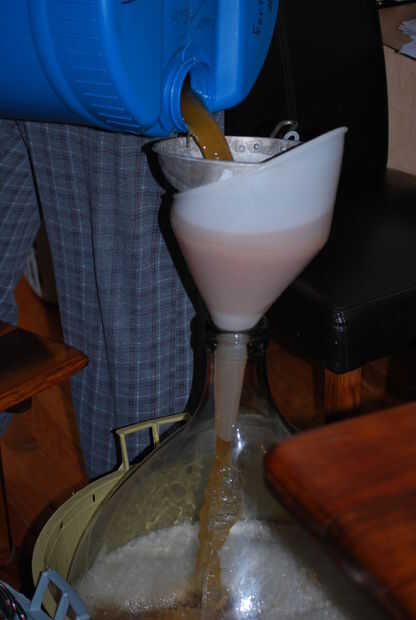 Después de la fermentación inicial, la cantidad de burbujas tiene disminuye o incluso se desplomó. Es tiempo para la fermentación del "estante" en un recipiente hace (preferiblemente de vidrio, acero, lexan o PETG). El primario debe ser puesto a través de un colador grande y en el secundario (imagen 6). (Usted puede agregar algunos vitamina C, ácido ascórbico, esto para reducir los efectos de la oxidación. Además puede utilizar una bomba peristáltica o un sifón para manejo de líquidos y ejecutar la solución por el lado del fermentador secundario.) Cualquiera que sea su método, es de vital importancia ser muy limpio en el trasiego. Una vez que la solución se transfiere, puede poner su bolsa de aire en el secundario y poner el mead en un lugar oscuro donde la temperatura es estable. En 1-2 meses, usted debe comprobar su hidromiel y colocarla otra vez (de las heces, que son la levadura precipitada y residuos de la fermentación.) Cada tormento sucesivas debe pasar a través de materiales de filtro más fino y más fino hasta que puede pasar a través de un filtro vinebrite. Una vez que puede ir a través de este filtro está listo para el embotellado.