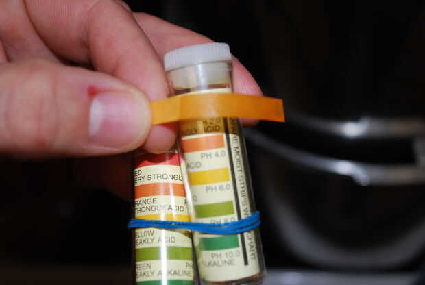 Quieres tener una buena cantidad de ácido en el fermentador primario. Podrá lograr esto por exprimir unas naranjas y unos limones en el agua cuando se establece la miel al calor. Para mejorar el sabor de la hidromiel y la sensación de la boca, Pele el limón y las naranjas en el lote. Compruebe que el pH en su final debe asegurarse de que está en el rango de 3.5-4 pH (imagen 3). Si usted necesita ir más bajo, añadir un poco de mezcla de ácido o el jugo de limón.