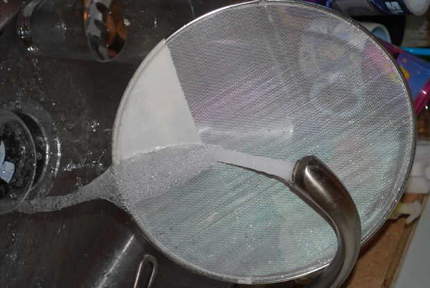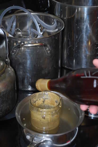 Una nota importante sobre la miel es que usted no tiene que hervir para esterilizarlo. Levaduras silvestres pueden ser matados en 22 minutos a 147 F (64F). La más importante necesidad de hervir la miel es facilitar la eliminación de la cera disuelta inherente a la mayoría miel disponible en el mercado. Si no eliminas esta cera la levadura puede tener un tiempo difícil mantener a sí mismo en la solución aglutinan y caen a la parte inferior de la fermentadora. Mientras se está calentando la mezcla de agua miel, empezará a formar una espuma en la parte superior de la solución. Utilice el protector de salpicadura limpio para quitar esta espuma (imagen 4). Una vez retirada la espuma, puede Agregar el clavo, vainilla, cardamomo y canela al lote.