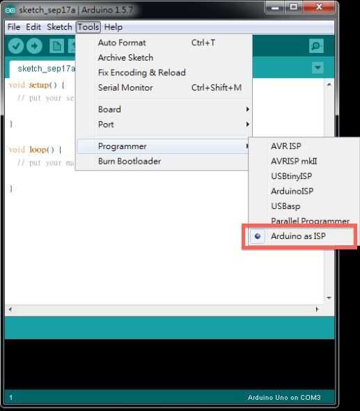 4) Seleccione "Arduino como ISP" como programador