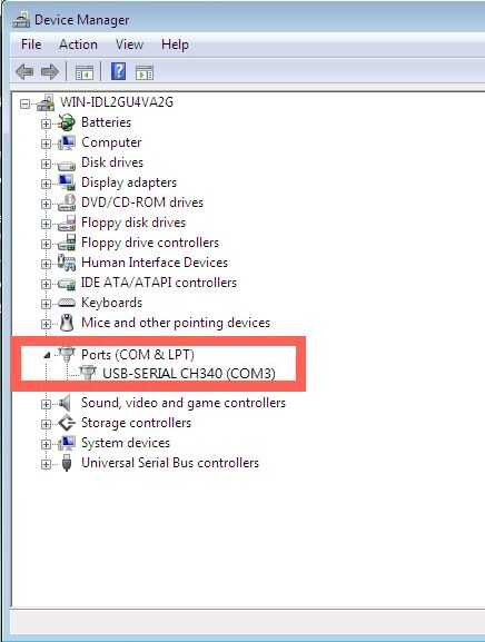 1) dispositivo de sistema administrador de puertos (CH-340 es COM3 en este ejemplo)