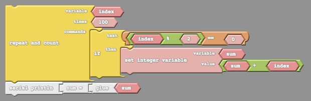 若迴圈只能做一成不變的事那就小看迴圈了。 在此例中, 咱們要在每個輪迴內加入判斷式, 若成立才做動作, 也就是在1到100之中, 我們跳過奇數, 只累加偶數。