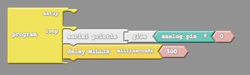 搞完馬達, 接下來要玩搖桿。 本機器手臂附有二顆搖桿, 每一顆皆有橫縱兩向, 總共四向, 所以能控制4顆馬達, 搖桿依次接到 A0, A1, A2, A3。 所以我們只要讀取這幾個腳位的值便可知道搖桿的角度。 每個腳位值的範圍從0到1024。 此例中我們讀A0腳位的值然後由序列埠印出。