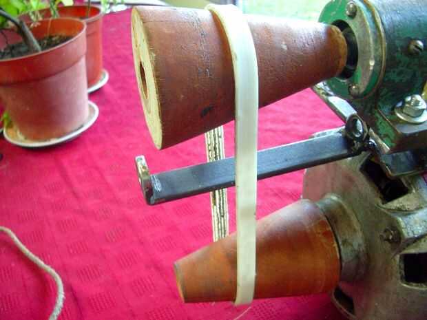 Finalmente resolví dejarme de experimentar con la fabricación de la correa, y tratar de conseguir una hecha. Tuve suerte, conseguí una de repuesto de algún telefónica, demostró ser sumamente resistente. Yo hubiera preferido fuera de sección redonda o trapezoidal, pero la única había era plana. Por suerte, anduvo bien.