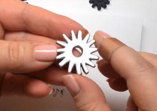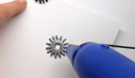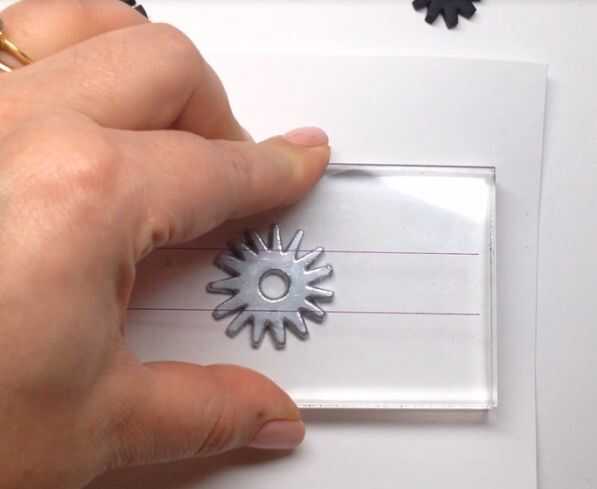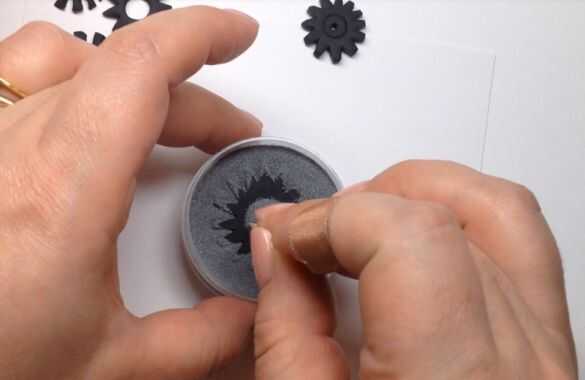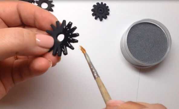 Creando el efecto metálico en los engranajes con polvo de grabación en relieve.