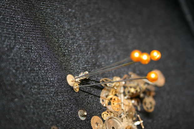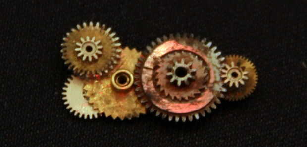 Armar los engranajes de una manera que (a) cabrá en el escarabajo y (b) parecen un tren de engranajes de trabajo. Acoplamiento de algunos dientes juntos.