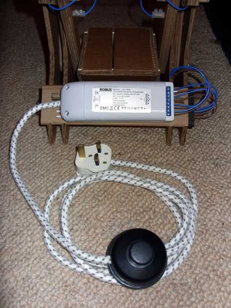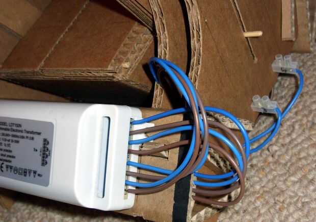 Los conectores de cuatro tornillo en el exterior en la parte inferior están en las líneas positivas salen la lámpara. También debe tener cuatro hilos sueltos que son las líneas negativas. La lámpara es lo suficientemente grande como para que usted puede sujetar el transformador que de alguna manera. Usé algunas almohadillas adhesivas. Cortar todos los cables y use los tubos en la estructura de la lámpara para mantener los cables organizados y alimentarlos en su transformador de salida terminales, prestando muy especial atención a la polaridad. Use una continuidad o medidor de ohmios para comprobar las conexiones de nuevo. Añadir el cable de red.