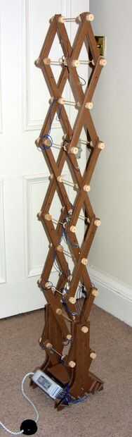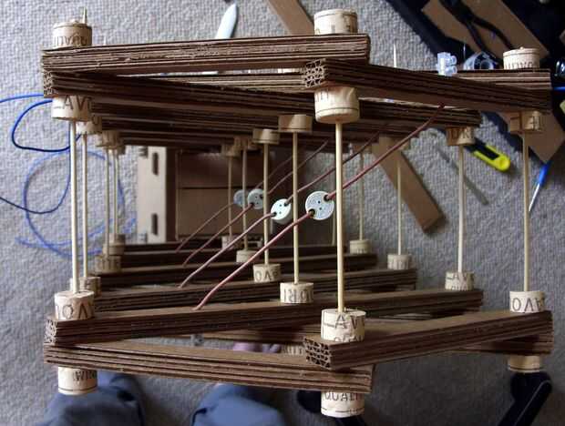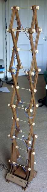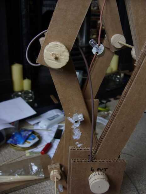 Enrosque cada plomo de sostenedor de la lámpara a través de uno de los agujeros en el montante, para que cada paralelogramo «célula» tiene un portalámparas suspendido diagonalmente en él. Recortar las puntas del sostenedor de la lámpara, el aislamiento (pic) y poner un tornillo de terminal en el exterior para mantener en su lugar (pic).