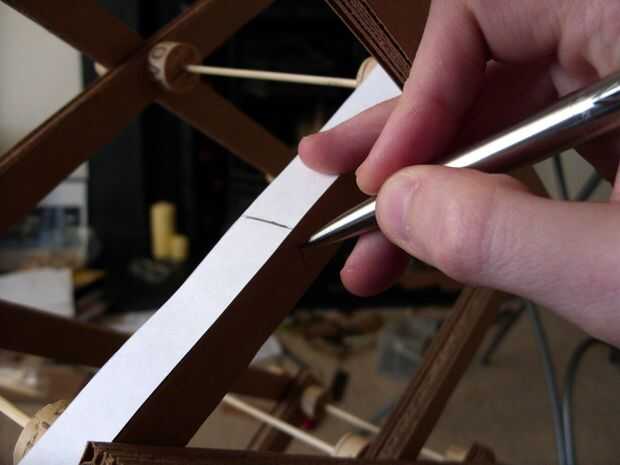 A la derecha, necesita poner unos agujeros en sus interiores puntales a los cables del portalámparas a través del hilo de rosca. Gire la lámpara para que la Tape 1 OUT vertical quede frente a usted. Marca que son puntales para recibir una perforación. Echar un vistazo a la imagen de abajo que tiene notas en las costillas para perforar. Los agujeros deben estar en el punto medio en el que la mitad de la costilla. Cortar una plantilla de papel la longitud de la costilla corta, el centro de la misma y utilice para medir donde los puntales de la marca. Hacer un agujero en el centro de cada marcado puntal, lo suficientemente grande para el cable que se arrastra de sus portalámparas para caber a través.