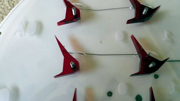 Los autobuses están hechos de alambre de piano. Tenga en cuenta la banda de ángulo en la parte superior, que se utiliza para ajustar la longitud final.