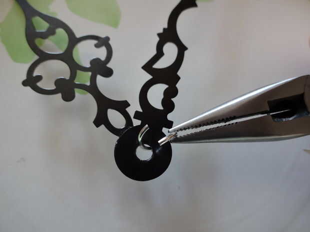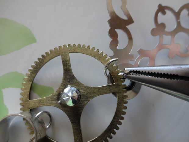 Abra el anillo de salto y bucle de un extremo a través de la abertura en la parte superior de las agujas del reloj, entonces, alrededor del borde de una de las dos secciones inferiores de los grandes del engranaje antes de cerrar el anillo del salto.