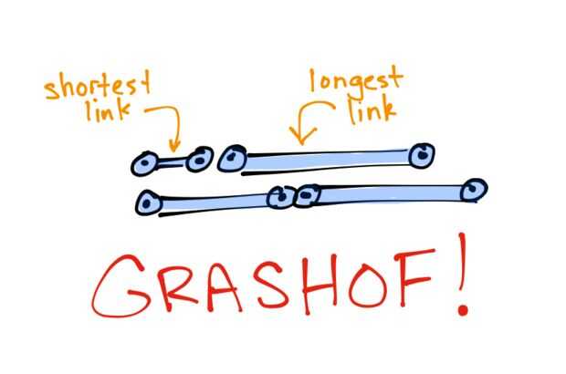 Ver mi video y fotos de cómo diferentes tipos de vínculos de cuatro barras mueven. Algunos de ellos gire continuamente, algunos alcanzan un punto de parada, y debe volver a la forma en que llegaban. Para este tipo particular de mecanismo, el motor proporciona entrada rotatoria continua y hace que todo funcione como un eje de balancín de la manivela. Esto significa que usted tendrá que prestar atención a algo que se llama la condición de Grashof. De las cuatro barras que se utiliza, el más largo y más corta combinada necesidad de ser más corto que las otras dos barras combinado. Si se cumple esta condición, el acoplamiento se llama a un acoplamiento de Grashof y va a trabajar para este diseño. (Ver fotos para ver ejemplos)