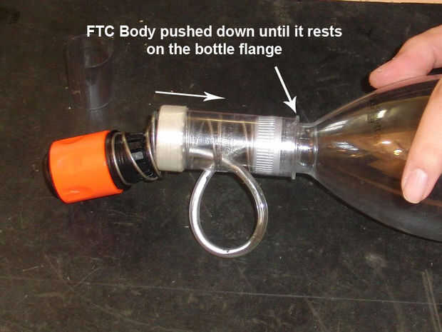 Atornille la tapa en la botella del aumentador de presión y apriete. Ahora baje el cuerpo de la FTC sobre la tapa hasta que quede en el ala de la botella. Esto le ayudará en el sustentador durante la aceleración.