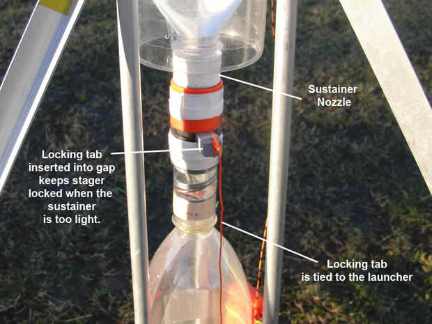 Si el sustentante no es suficientemente pesado, puede insertar una lengüeta en el espacio entre el cuello y la parte interna del conector rápido. Esto es en el espacio de la pieza más corta de la FTC. Ate esta lengüeta con una cadena a la plataforma de lanzamiento. Cuando se lanza el cohete, la lengüeta se Haz sacada, pero aceleración mantendrá el sustentador en la posición cerrada hasta que el aumentador de presión funciona por empuje.