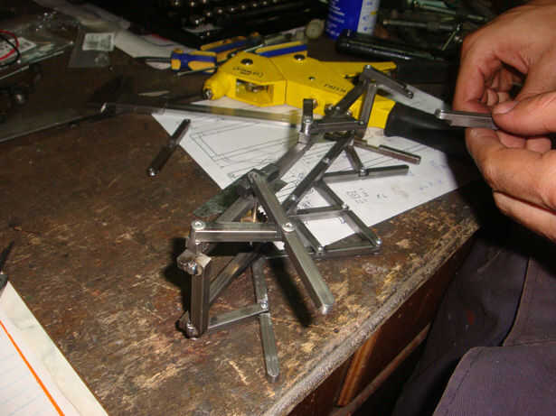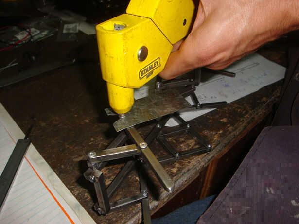 La manera más fácil pensé en realizar las conexiones entre todos los bares era con remaches. Acabo de poner un pedazo de estaño entre las piezas que quería montar, así que cuando he quitado la pieza de estaño será una brecha que permite el movimiento de las piezas.