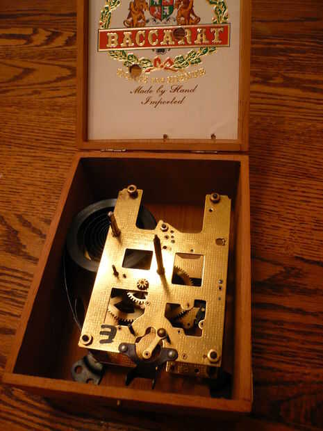 Conseguir sus manos en una caja de puros, que se puede encontrar a buen precio en tiendas de antigüedades la mayoría del tiempo, o usted puede solicitar un humidor local. Asegúrese que la caja es lo suficientemente grande como para sostener la caja del reloj (con la primavera herida bastante apretados) y que es lo suficientemente profundo para que el reloj a cubrirse completamente para que solo el post se eleva por encima de la tapa. Coloque la caja del reloj en la caja de cigarro y cuidadosamente permitir el acero del resorte para relajarse, que tratará de hacerlo muy rápidamente. Asegúrese de que el mecanismo está apoyado en una esquina de la caja de cigarro. El acero del resorte se desenrolle y mantener el mecanismo en la caja con la tensión del resorte. Para mayor estabilidad, puede atornillar la caja en el piso de la caja de cigarro.