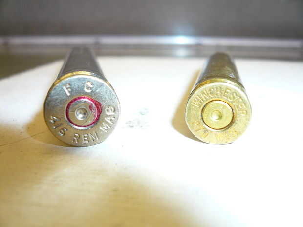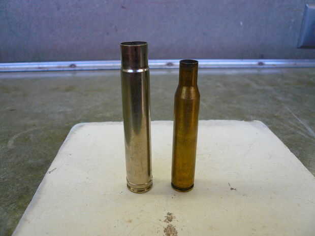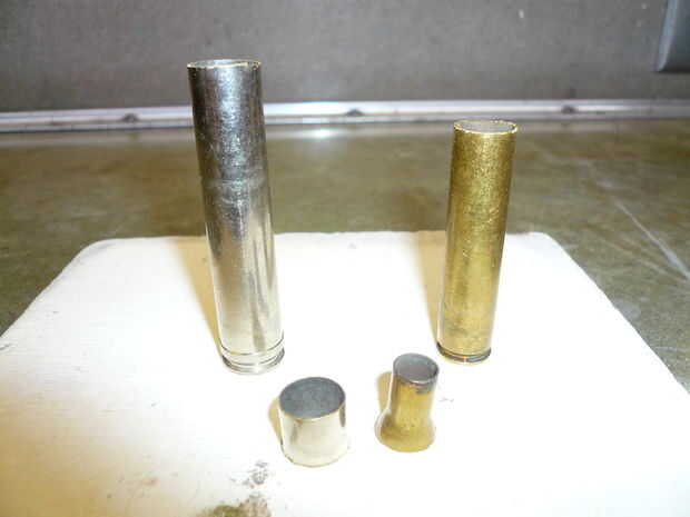 Hay conchas diferentes que se encajan entre sí bastante bien. Encontré que latón Winchester 270 de encajan, níquel-revestido 416 Remington mags bastante bien. Utilice una herramienta dremel con disco de corte para cortar los extremos cónicos de las cáscaras por lo que te queda solo los ejes. Los extremos de la arena plana y deshacerse de cualquier borde filoso. Usé una tachuela tapicera que era del mismo diámetro que el extremo abierto de la cáscara de Winchester 270 para usar como tapa. Cualquier plano o semi cúpula de latón o níquel casquillo funcionará siempre y cuando coincida con el diámetro de la cáscara.