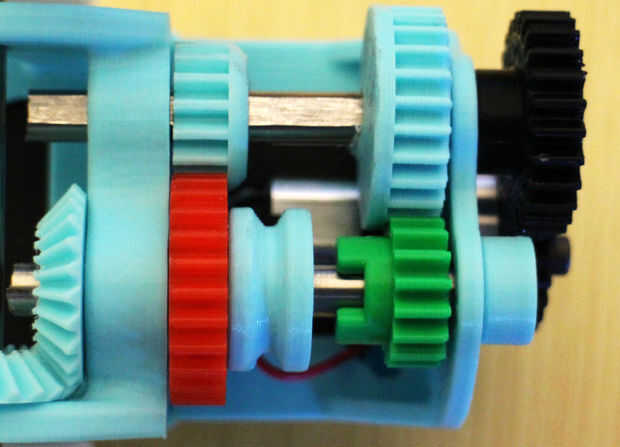 Los embragues son mecanismos principalmente encontrados automóviles y otros vehículos de carretera, y se utilizan para cambiar la velocidad del eje de salida, así como desactivar o activar el giro del eje de salida. Un mecanismo de embrague implica al menos dos ejes, el eje de entrada, impulsadas por una fuente de energía y el eje, que mueve el mecanismo final. Como ejemplo, voy a explicar un mecanismo sencillo de embrague 2 engranaje, hace referencia a la imagen de arriba. El eje de entrada tendría dos engranajes en él de diferentes tamaños (los dos engranajes azul en la parte superior del eje), y el eje de salida contiene dos engranajes de acoplamiento con los engranajes en el eje de entrada (los engranajes rojos y verdes), pero pueden girar libremente alrededor del eje de salida, por lo que no conducen. Un disco de embrague (la pieza azul acanalado en el medio) se encuentra entre los dos engranajes, gira con el eje de salida y puede resbalar a lo largo de él. Si el disco del embrague se presiona contra el equipo rojo, el eje de salida participar y gire a la velocidad definida por el cociente del engranaje de ese sistema de engranajes (3:2). Si el disco del embrague se presiona contra el equipo verde, el eje de salida conduce a una desmultiplicación diferente, definida por aquel conjunto de engranajes (2:3). Si el disco de embrague se encuentra entre los dos engranajes, el eje de salida está en punto muerto y no esté siendo conducido.