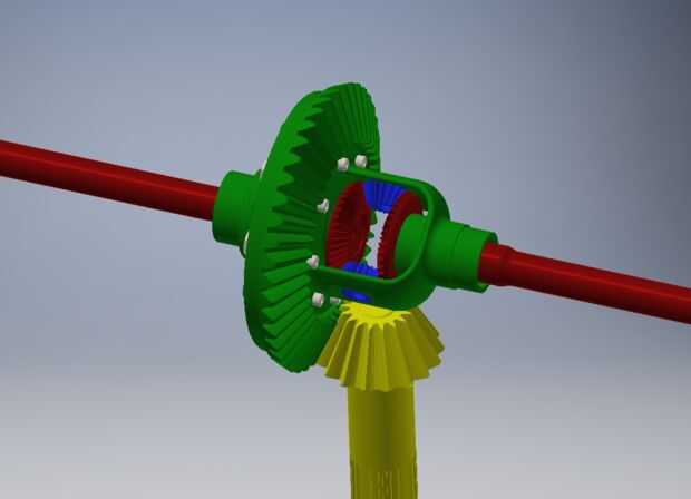 Un diferencial de engranajes es un mecanismo muy interesante que un engranaje de anillo cónico y cuatro más pequeños engranajes cónicos (dos engranajes de sol y planeta dos engranajes órbita a su alrededor), actuando algo así como una caja de engranajes planetaria. Se utiliza sobre todo en coches y otros vehículos, ya que tiene una entrada del eje ejes de salida dos unidades (que se conectan a las ruedas) y permite que los ejes de dos salida a girar a diferente velocidad si necesitan. Termina que el promedio de las velocidades de rotación de cada eje siempre debe igualar la velocidad de rotación del engranaje del anillo.