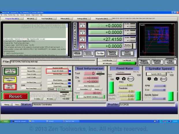• Ahora que tenemos nuestro GCode en lugar lo primero que va a hacer es sondear la superficie de la Junta en varios lugares. Devuelve los valores de Z en su código más adelante hacer un mucho mejor grabado en la placa. Esto nos permite tener graba la más precisa en el revestido de cobre que nos sea posible con los rastros aislados que necesitamos. · Hay dos maneras que usted puede dejar la sonda de Mach3 la Junta. Una forma es hacer clic en solo negro primero el ciclo presionando start sólo va especificamente paso por paso. Esto toma tiempo y puede ser tedioso, pero se asegura de que todos los valores para el eje Z son precisos.