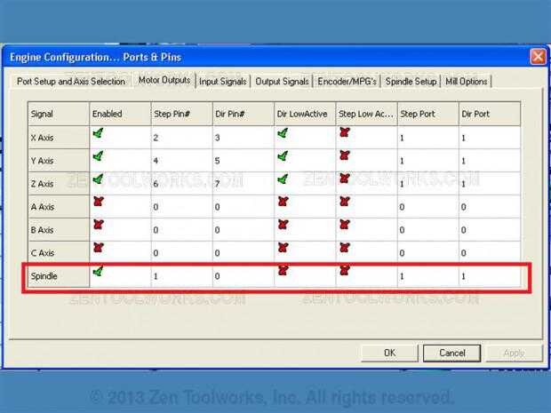 • Una vez tienes tu paquete de huso configurado como arriba puede luego vas a configurar el huso en el software de Mach3. Para ello vamos a Config > puertos y alfileres, entonces usted desea haga clic en la ficha de salidas Motor.