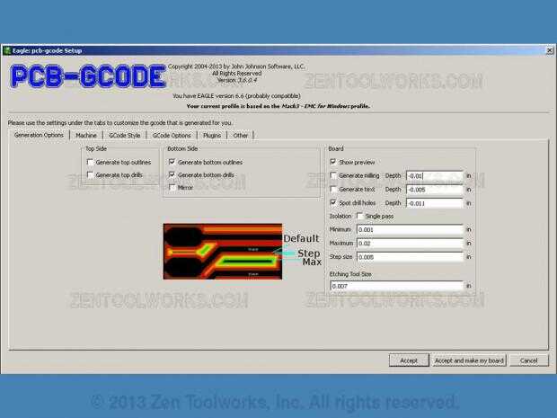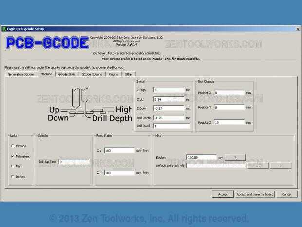 • Debemos también cambiar nuestras opciones de eje de Z para reflejar nuestro granito de arena que se desea utilizar para el corte de nuestro tablero del PWB. La Junta que estamos utilizando es no más de 1 milímetro de espesor así que tenemos que tener la profundidad de taladro más de-1 mm. La razón que necesitamos un valor negativo es que estamos utilizando la superficie de la tabla sí mismo como nuestro cero del eje Z. Queremos que nuestro taladro para perforar la tabla donde queremos hacer nuestras soldaduras para nuestro escudo. · También tenemos que cambiar las opciones de la ficha de opciones de generación lo que se muestra para nuestro particular granito de arena: