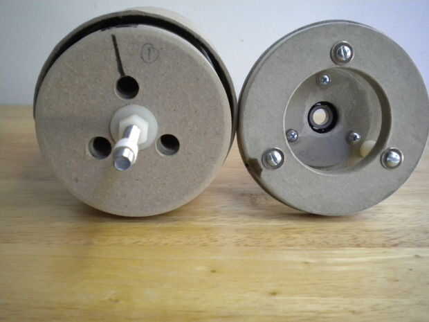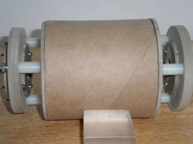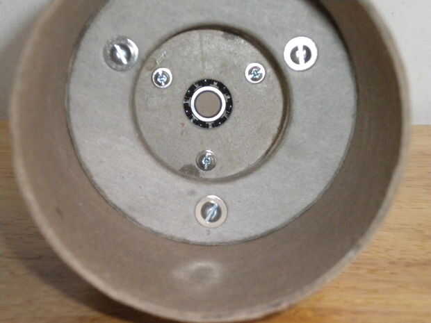 Estos diferentes ángulos foto Mostrar montaje del rotor, apoyado por las placas de extremo y retenedores de rodamientos, suspendidos en el shell. Desafortunadamente, había demasiado espacio de maniobra entre el eje del rotor y el diámetro interior de los rodamientos (rodamientos métrico, perno del eje del no!!!!). Así que utiliza un 1/4" de diámetro tubo de cartón de un rollo descartado de hilo dental y cortar una longitud de 1/4" para hacer una camisa del eje, peló una sola capa de papel para un calce en el agujero. Corte y se deslizó otra manga de 1/4 "x 1/4" a cada extremo del eje por lo que descansaron contra los cojinetes. Esta solución mantiene el eje seguro y prevenir atrás y juego entre los cojinetes. Por último, palomillas de fijación placa de retención para los espaciadores fueron intercambiadas para que tuercas facilitar la extracción de anillos de parada exterior.