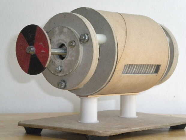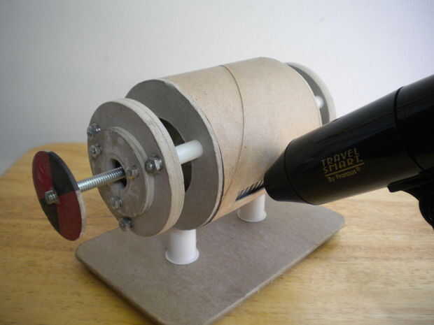 La turbina ensamblada debe parecerse a esto. El disco rojo y negro en el eje se hizo de un anillo de seguridad rechazada. Mantener un cabello secadora cerca de la ranura (uso fresco ajuste si está disponible) y dirigir la corriente de aire en un ángulo en la turbina como se muestra para que las cosas del balanceo.