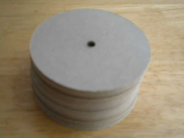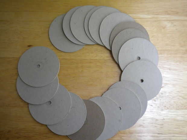 Retire el paño o cubierta de carpetas de plástico. Corte de 20, 3-1/2" Diámetro rotor los espacios en blanco de la cartulina. En realidad, sólo 16 espacios en blanco son necesarios, pero son útiles como repuestos extras. Por cierto, he utilizado tijeras para el prototipo; pero luego cambió a un cortador de círculo ajustable para la versión posterior ahorrar tiempo. Perfore un agujero de eje de 1/4" a través del centro de cada espacio en blanco.
