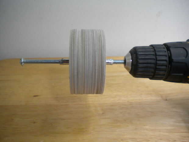 A continuación, el eje del portaherramientas en el taladro y fije el taladro al borde de la superficie de trabajo. Moler los espacios en blanco con papel de lija de curso a 3-1/8" de diámetro con una fuerza ligera pero consistente en el bloque de lijado. Recuerde, presión desigual puede producir puntos planos en los espacios en blanco