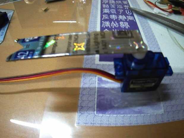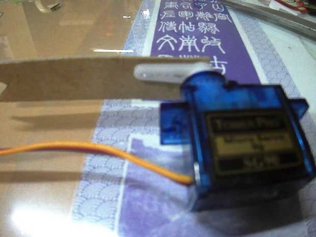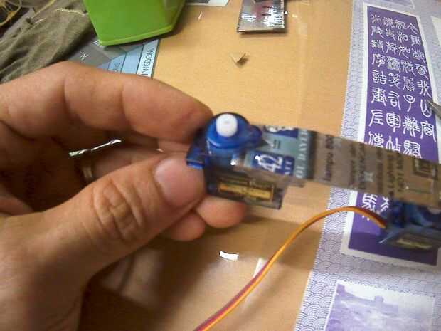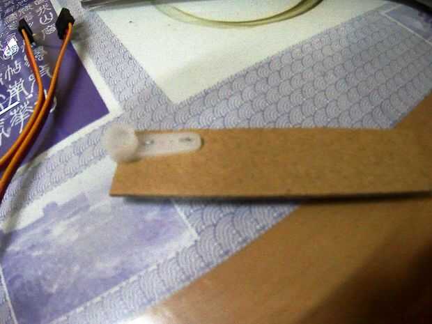 Simplemente utilizar cinta adhesiva para unir las partes. El cartón tiene una longitud de 2.5" a 3" cada uno. El cartón también se puede conectar a los cuernos de los servos con las grapas a través de los orificios de los cuernos. Cortar una "V" para un mejor agarre al cuerpo del servo.