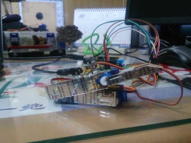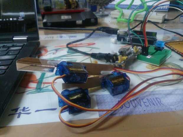 Este es mi primer prototipo de brazo de cartón grueso para las pruebas. Funciona bien, pero no se último durante mucho tiempo depende de cómo densamente el cartón está utilizando. En el siguiente paso le mostrará el brazo plástico, más rígido. Sigue leyendo este paso hasta el final para averiguar cómo están conectados los servos.