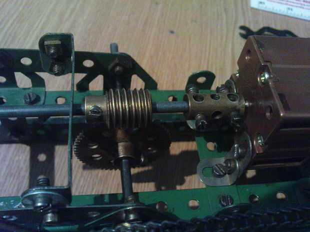 Ahora esto es la más incómoda. Las piernas son muy difíciles de subir para el motor, pero conseguirá, pero sólo si el equipo está correctamente colocado. El engranaje de gusano tiene que ser tan lejos aparte de la rueda de engranaje como sea posible, sin deslizamiento. Para ajustar la altura del engranaje de gusano, simplemente afloje de los tornillos que sostienen el ángulo doble tira en su lugar y ajustar las eclisas arriba y abajo hasta que tienen el engranaje de gusano engrane correctamente con la rueda del engranaje.