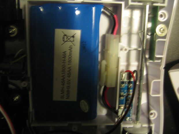El Spykee robot utiliza un 9.6V NiMH batería para la alimentación (se muestra en la figura 13). Se sienta debajo del controlador principal tablero del PWB. El cargador de batería incluido trabaja de 100 a 240VAC para que el robot puede ser recargado en la mayoría de las regiones del mundo incluyendo Asia y Europa.