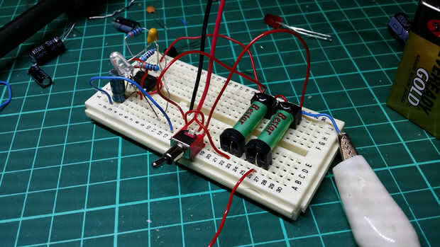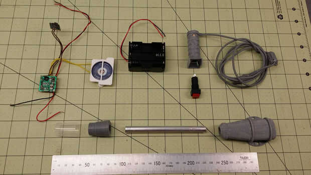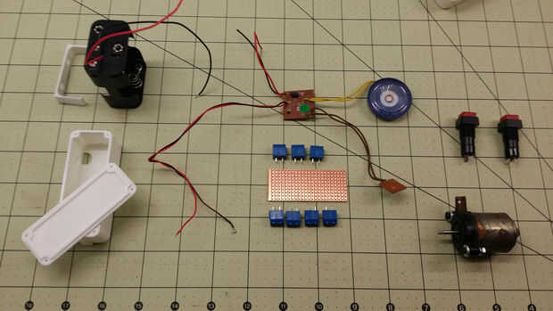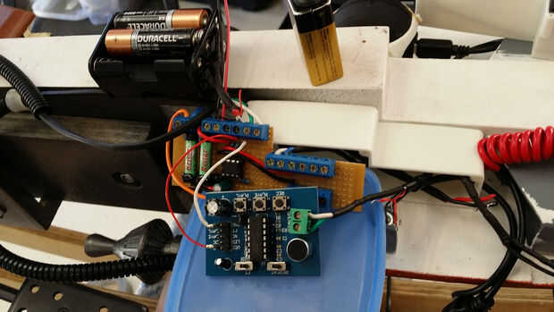 Los primeros 9 o 10 imágenes mostrando mis ideas iniciales sobre el / los intentos de usar las tripas de un bláster de juguete que lamentablemente falló debido a un módulo de sonido frito durante la construcción. Mi solución fue usar una grabación / reproducción módulo para la sound blaster y construir un módulo LED parpadeante utilizando un temporizador 555. La próxima edición con que me encontré fue cambiar la reproducción de sonido y luz intermitente con el interruptor momentáneo mango montado SPST N/O. Mi solución fue incorporar una configuración de doble relé para accionar dos circuitos simultáneamente.