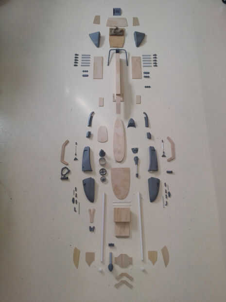 Una vez en la etapa donde tienes 3D impreso todos los componentes y perfil cortar todas las piezas de madera que estará listo para montar algunas de las partes, teniendo en cuenta que algunas partes tendrán que dejar separados para la pintura como pueden ser por ejemplo un color diferente como las paletas de la dirección y sus monturas. Dicho que es una buena idea para hacer un montaje y desmonte para asegurarse de que todo viene junto ok y no ensuciar en otras partes etc..