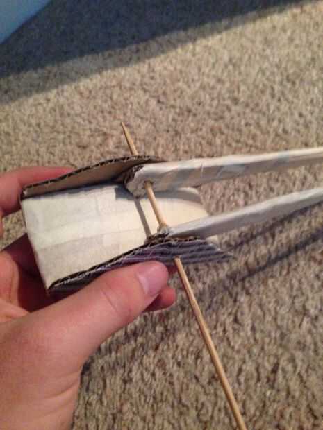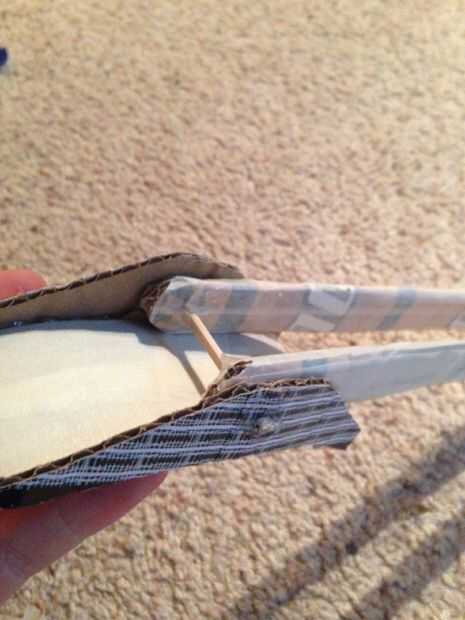 Luego, decidí hacer la característica plegable acción del delantero. En primer lugar, hice dos puntales cartón stock de piezas que dobla por la mitad. Entonces, hice la cantonera de un pedazo de cartón cuidadosamente cortado y doblado, con idénticas placas pegadas a los lados. A continuación, hice un refuerzo de cartón para el stock del pivote en. Asomó entonces agujeros en las piezas donde quería que pivote y utilizar pinchos de cocina para hacer ejes para ellos. Luego, justo había pegado el soporte a la parte superior de la pistola y había pegado abajo.
