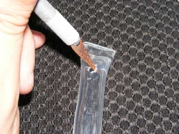 Usando un cuchillo de la manía, con cuidado corta un pequeño agujero de 3/4" de la sección fundida. El agujero debe ser aproximadamente 1/8" de diámetro y de forma irregular para producir un chorro de sangre en lugar de un chorro. A menos que quieras un squirt, es decir. En ese caso hacer el agujero perfectamente redondo como sea posible. Tal vez utilice una broca...