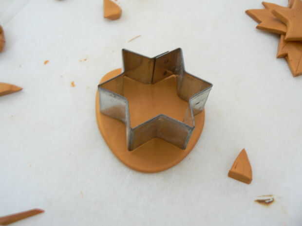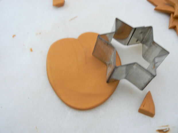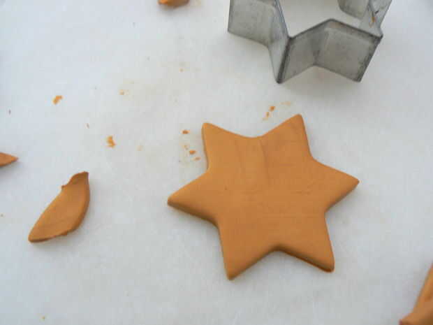 Hacer algo similar al paso 2, balanceo y amasar la arcilla. Toma un poco de esfuerzo! Estirar la arcilla. Luego utilice su cortador de galletas para cortar una estrella.