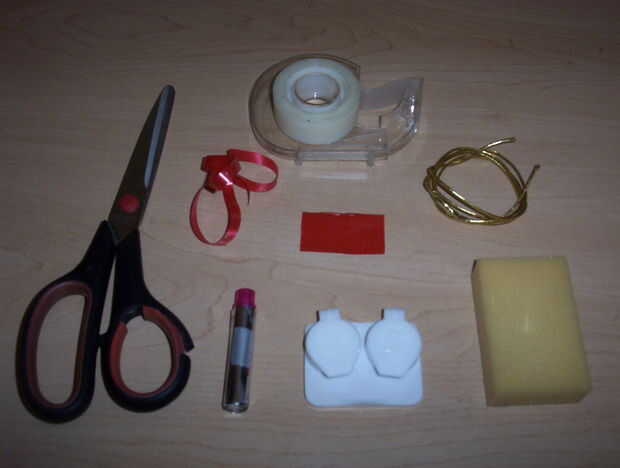 Lista de piezas consisten en 1. Caja de lente de plastic.contact.   2. tijera.   3. la cinta scotch.   4. pequeño pedazo de cinta roja. 5. el pequeño pedazo de cinta de envoltura de regalo.   6. largo pedazo de cuerda de oro o cadena a utilizar como un collar.  7. fragancia 8. Pequeño pedazo de esponja