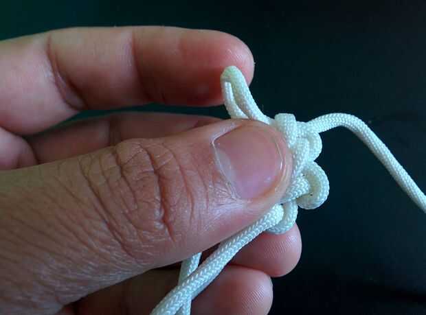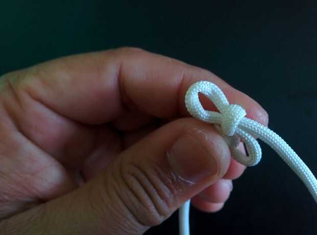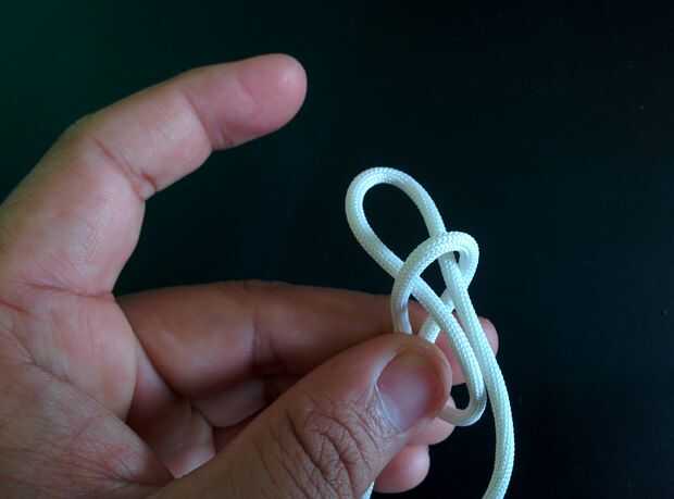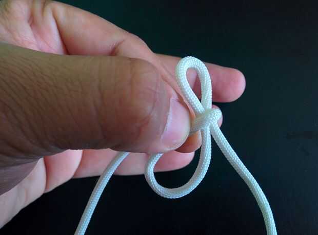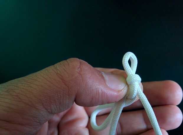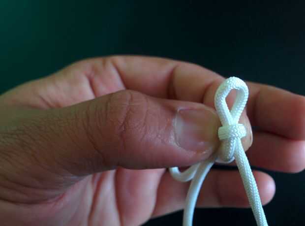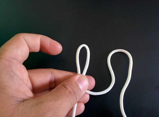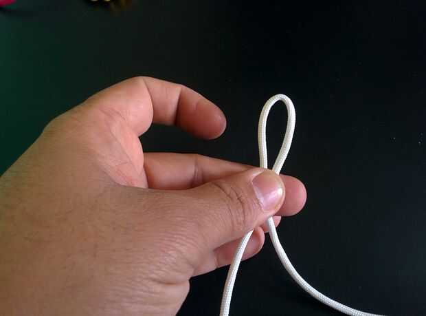 - Inserte el lazo en la derecha en el lazo que tiene en sus manos con el pulgar izquierdo.