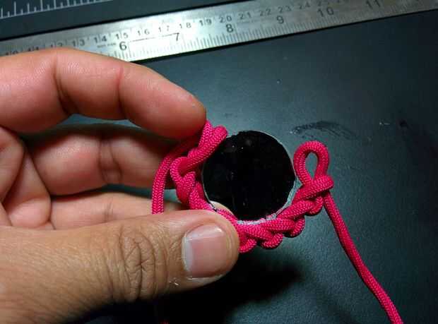 - Cuando proceda, intentar envolver el arreglo alrededor de espejo (Ver imagen donde he utilizado cordón rojo) para ver si tienes que hacer más nudos, en mi humilde opinión hará siempre menos un nudo, para que al estirarlo, el patrón llega a ser apretado.