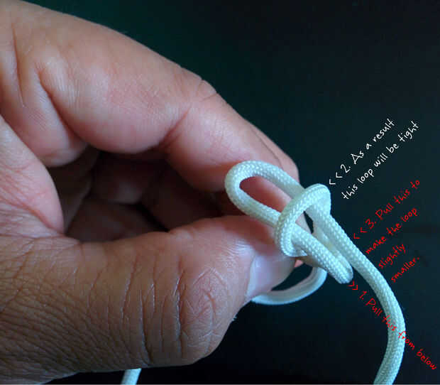 - Tire de la cuerda derecha para hacer el lazo un poco más pequeño. (Ver 4 imagen en secuencia.) Esto es importante