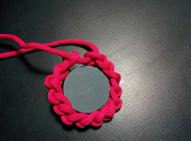 - Inserte el espejo y ajustar de tal forma que los bordes del espejo sentarse dentro del pequeño canal formado dentro debido al patrón de nudo continuo. Esta es la razón por qué este nudo es conveniente para envolver objetos (Ver imagen donde he utilizado el cable rojo).
