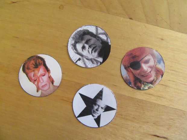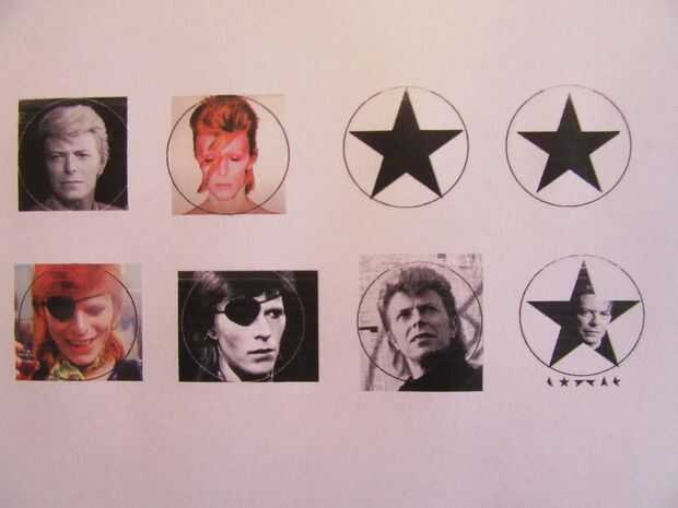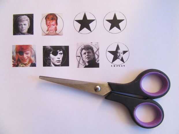 Es necesario convertir las imágenes en círculos. Para ello, creé un círculo sin un fondo. Ajustar hasta que ajuste las tapas dentro de diámetro (en mi caso, fue 2,5 cm). Entonces inserté Bowie de cuadro, ajustó (otra vez, de 2,5 cm) y lo envié al fondo (detrás del círculo).