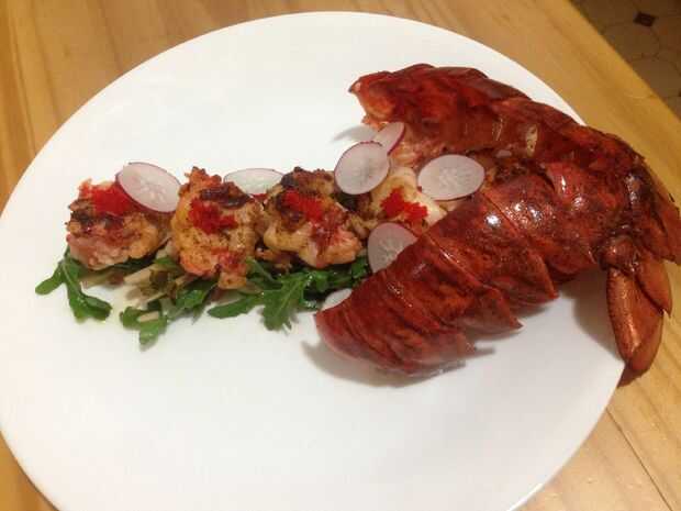 Estas colas de langosta de agua fría cogidos salvajes poco de Canadá han sido marinados en una mezcla de leche de coco, Ron de coco, jugo de limón, jengibre y nuez moscada. Luego estuvieron cubiertas con una mezcla de fina harina de maíz amarillo, pa